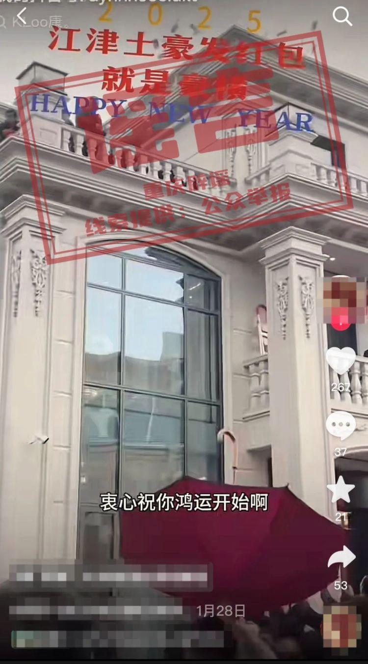 近期,某网民在互联网平台发布“江津土豪发红包就是豪横”的视频,画面显示有人在自建房屋顶撒钱,引发关注。